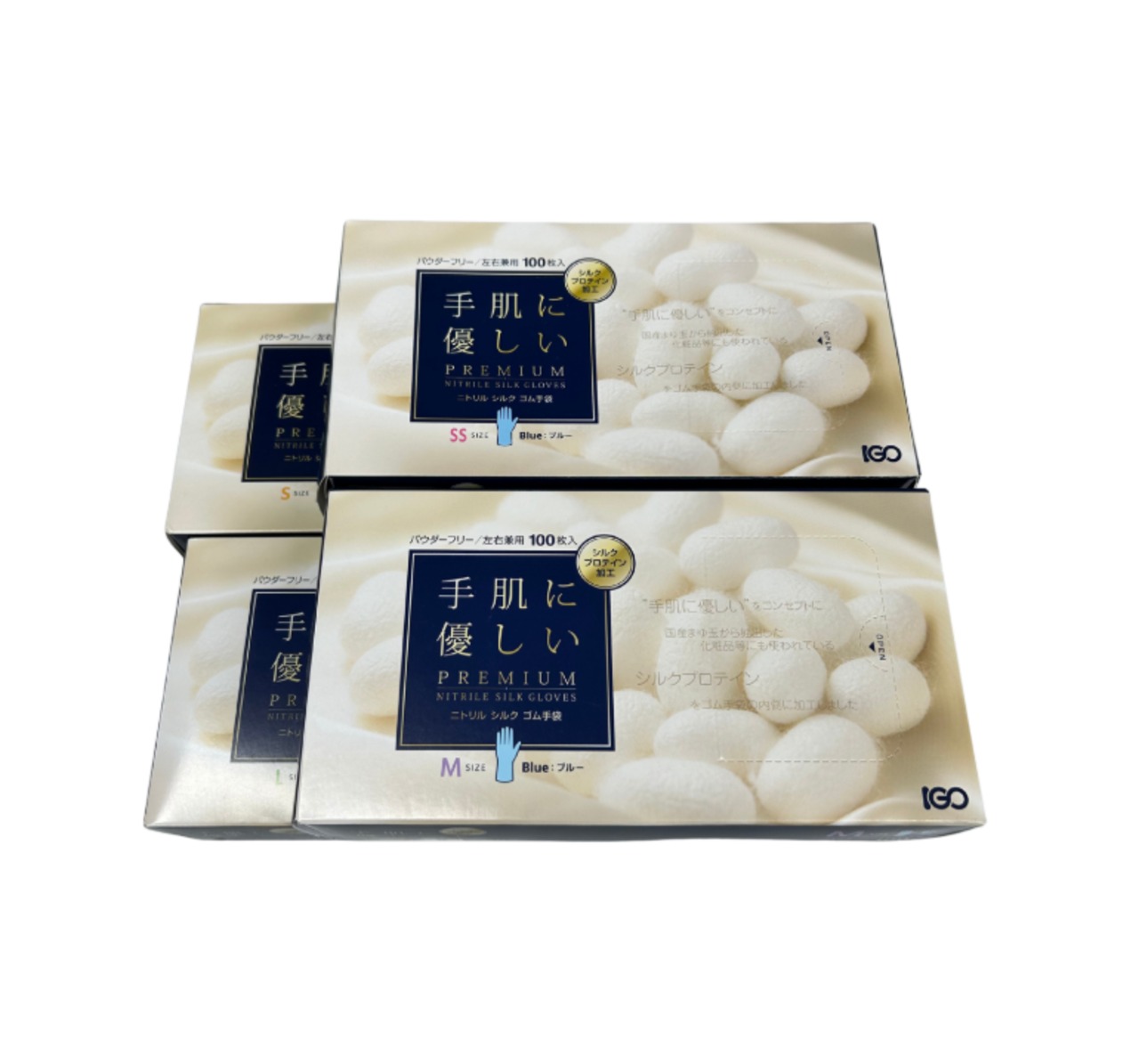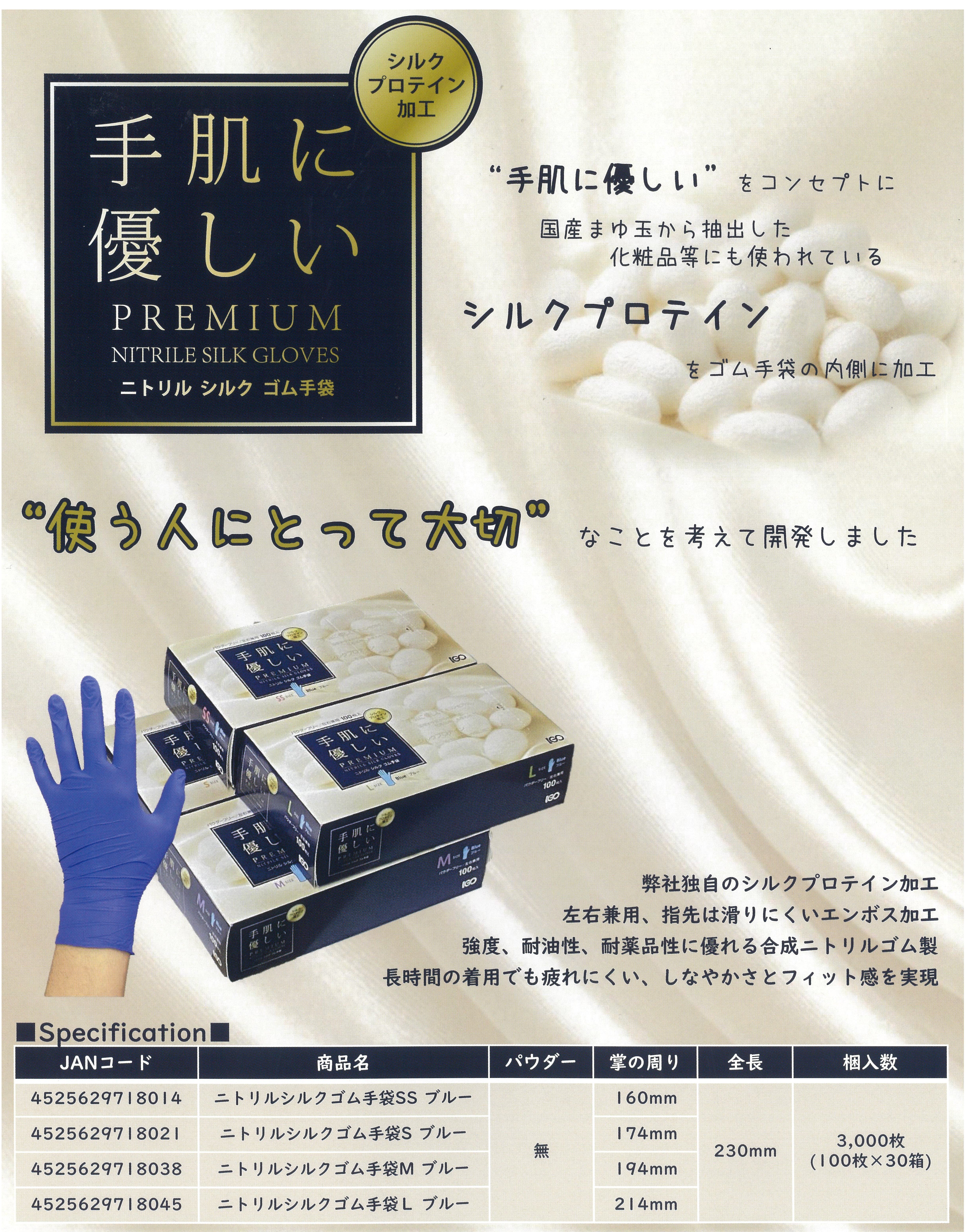 手肌に優しいをコンセプトに国産まゆ玉から抽出した化粧品にも使われているシルクプロテインをゴム手袋の内側に加工を施しました。